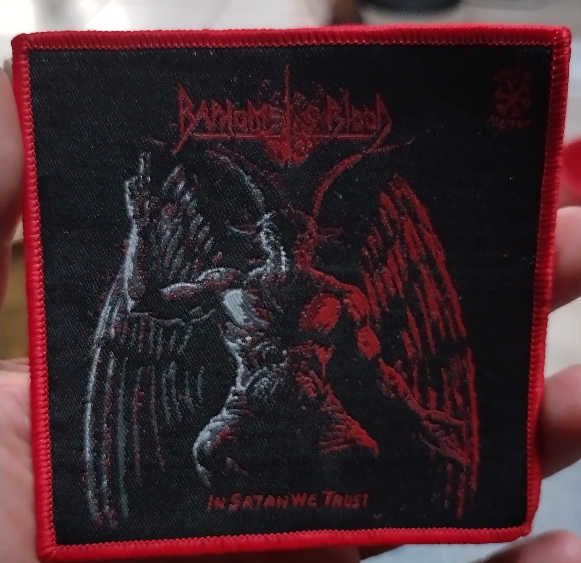 Baphomets Blood in Satan we trust Red Border Woven Patch